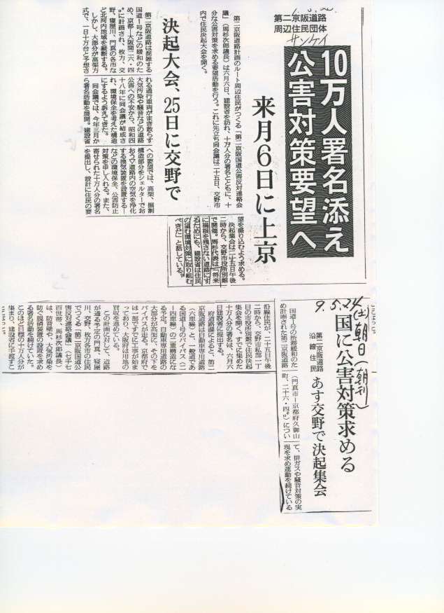 第2京阪道路の公害を無くそうという10万人の署名を持って、6月5日建設省に提出いたします。