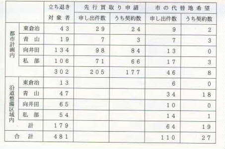 5月28日市民の会は、交野市と二国対策会議を開きました。 市民の会 最近の立退きの状況について知りたい。 市 次表の通りである (注)H9、3 末日現在